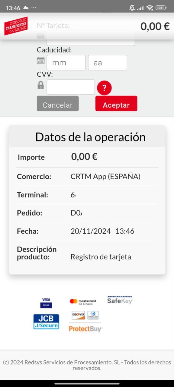 - Registrar tu tarjeta bancaria: Desde el menú lateral de la app, selecciona Registrar Tarjeta y completa los datos de tu tarjeta bancaria (número, fecha de caducidad y CVC). La app realizará un cargo de 0 euros para comprobar la validez.