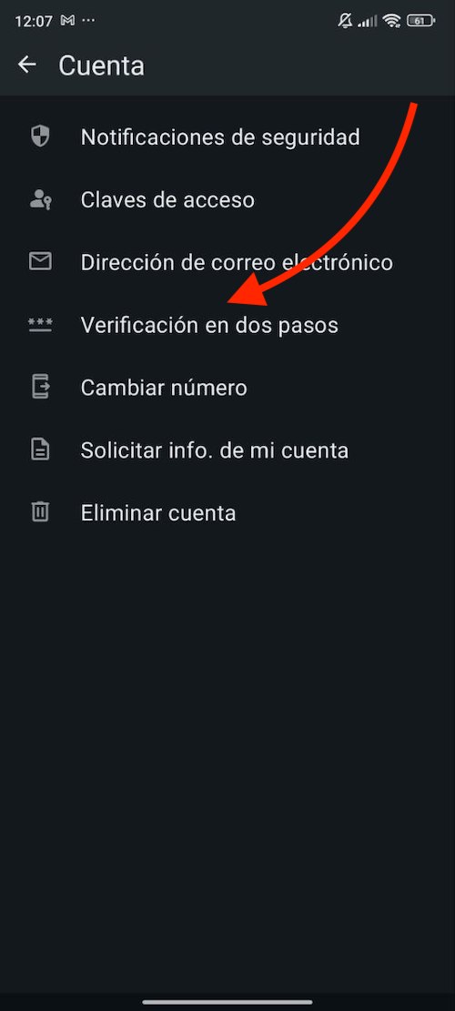 - Dirígete al apartado Cuenta y selecciona Verificación en dos pasos.